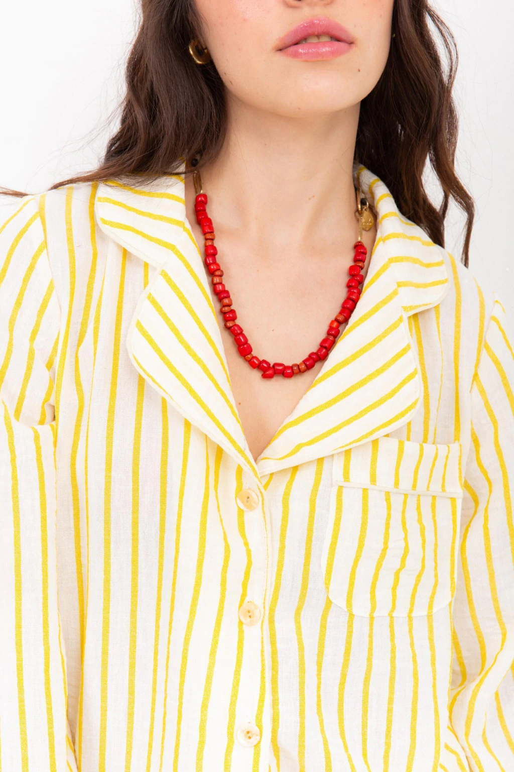 La Camisa Jazmín de Utzzia está confeccionada en un delicado tejido rayado que suma frescura y estilo. De mangas largas y cuello con solapa, incluye un bolsillo delantero que aporta un detalle práctico y moderno. Su diseño combina comodidad y versatilidad, ideal para looks casuales o de oficina.