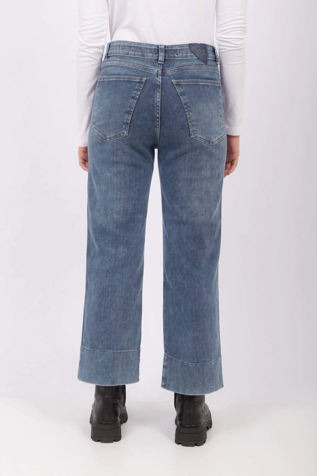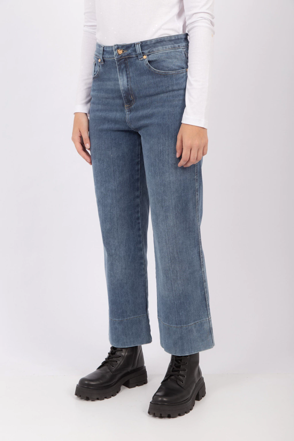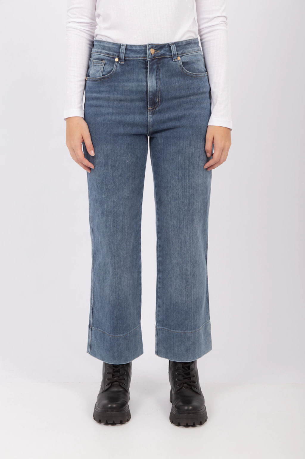 Jean de tiro alto con calce super confort fit, confeccionado en denim con spandex. Presenta diseño de cinco bolsillos, corte recto (straight) y largo cropped que deja el tobillo al descubierto. Su ruedo ancho le aporta un toque moderno y relajado, ideal para looks urbanos con estilo.