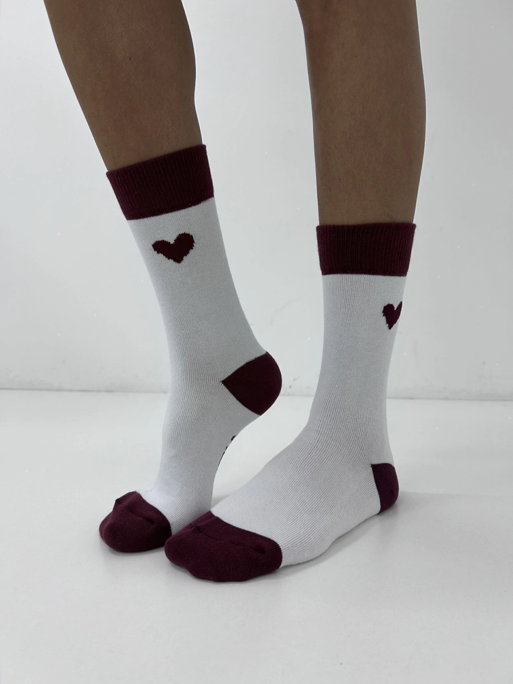 Pack de dos pares de medias básicas con detalles delicados, confeccionadas en mezcla de algodón y fibras sintéticas para brindar comodidad y durabilidad. Una pareja en blanco con detalles marino y la otra en blanco con detalles bordo, ideales para el uso diario y combinar fácilmente.