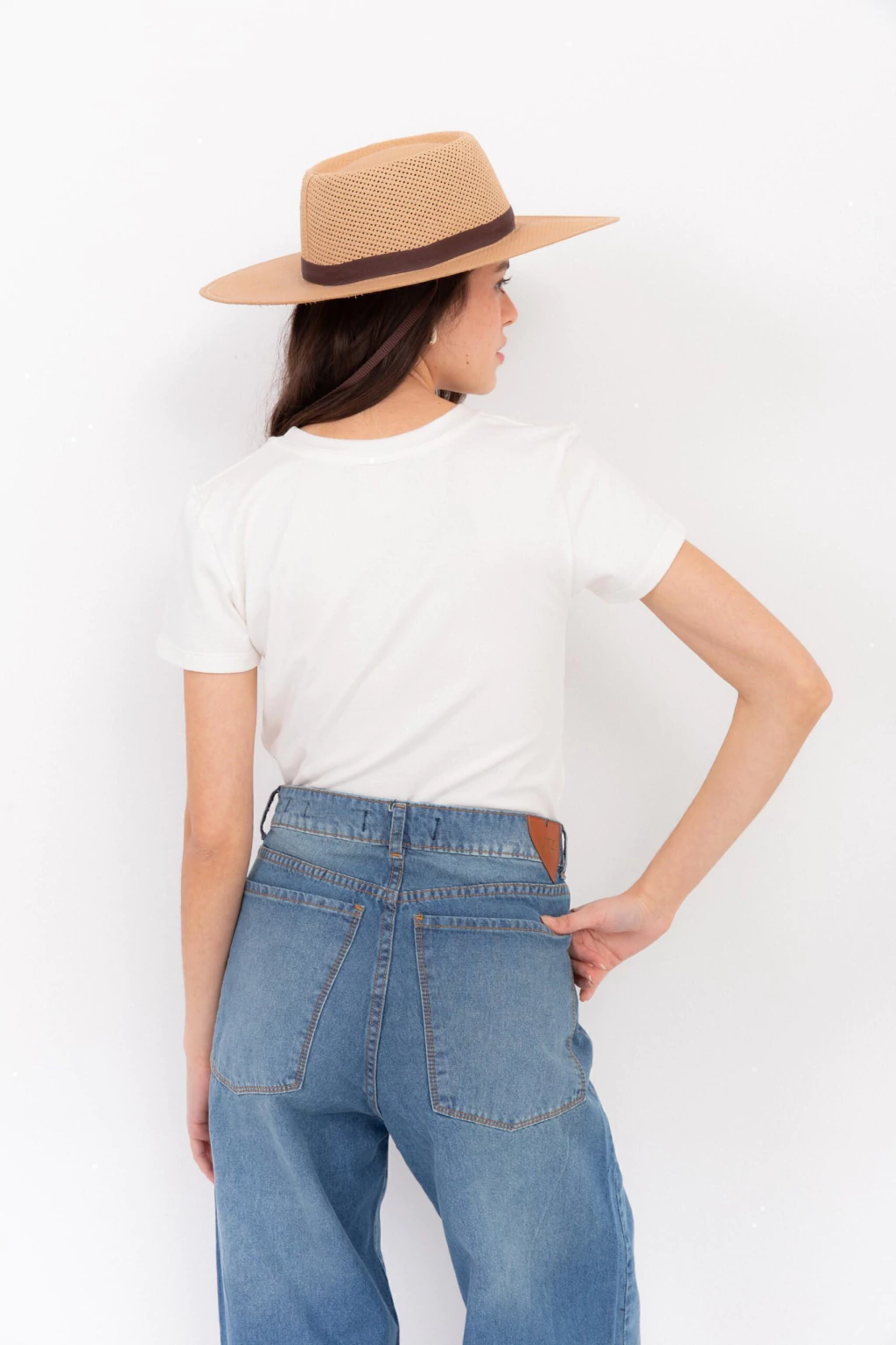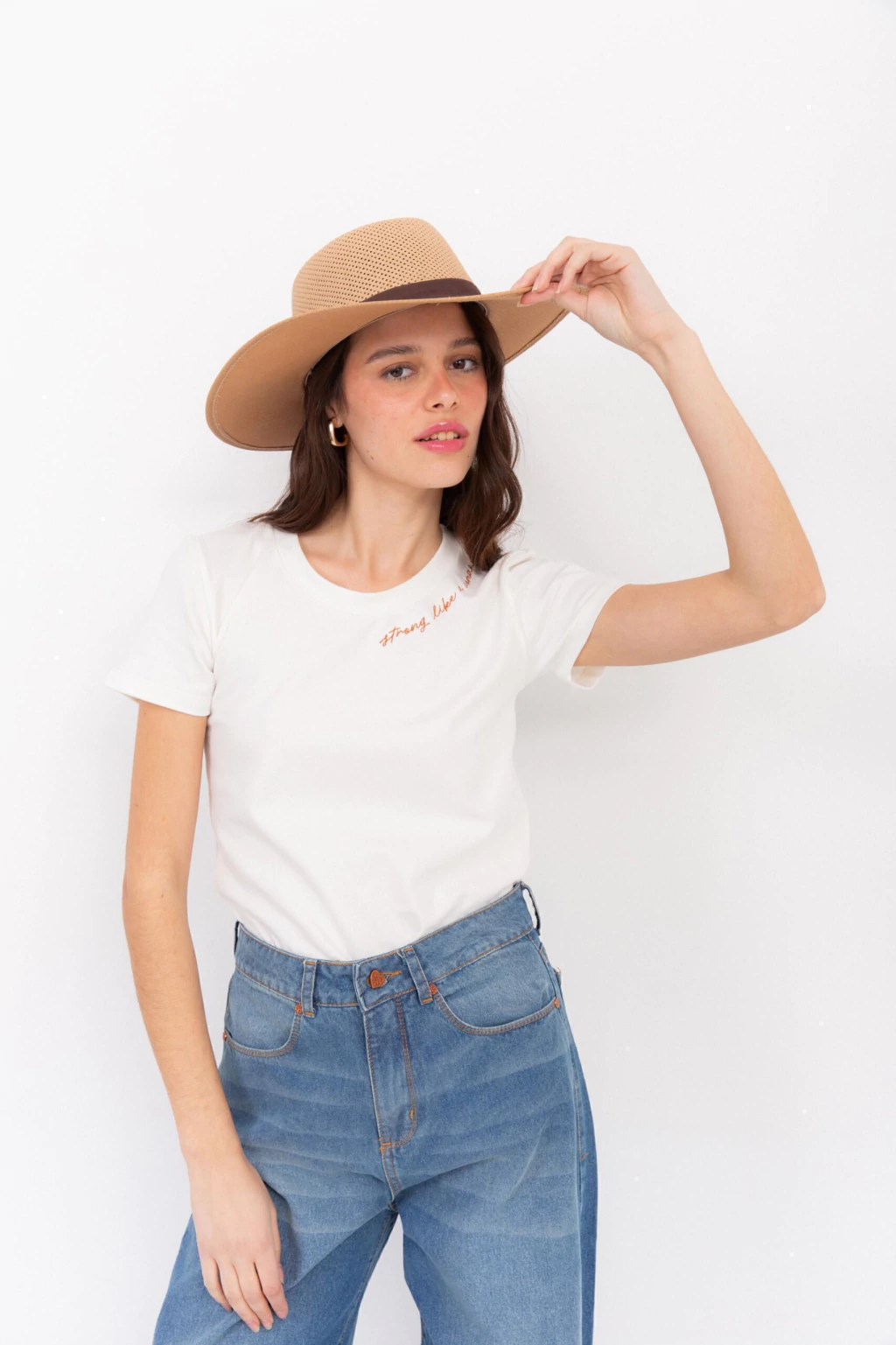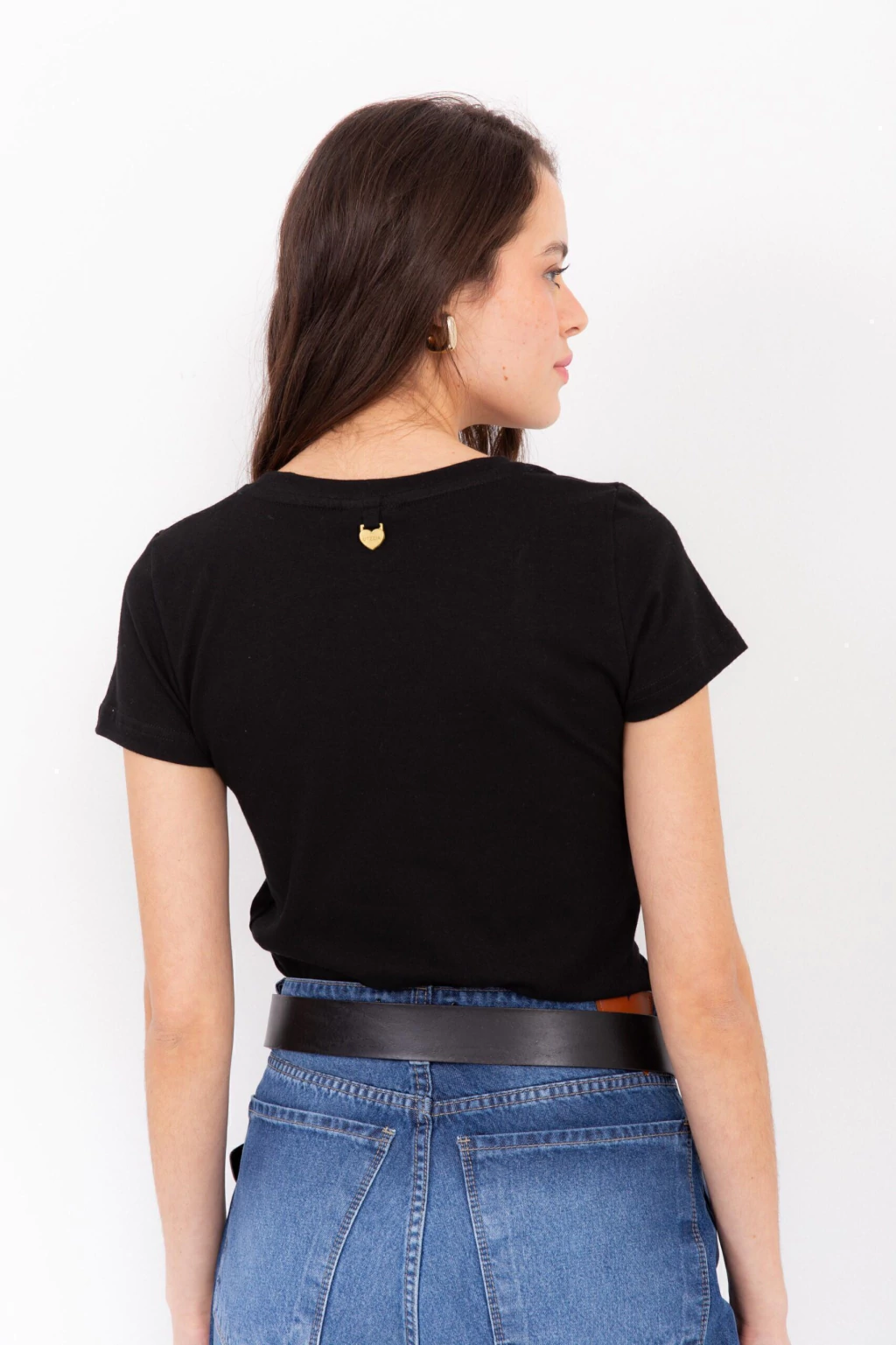 Camiseta básica con estampa, confeccionada en algodón con lycra. De cuello redondo y manga corta, presenta un delicado bordado en hilo bajo el cuello delantero que suma un toque distintivo. Con calce slim fit, se adhiere al cuerpo sin perder confort.