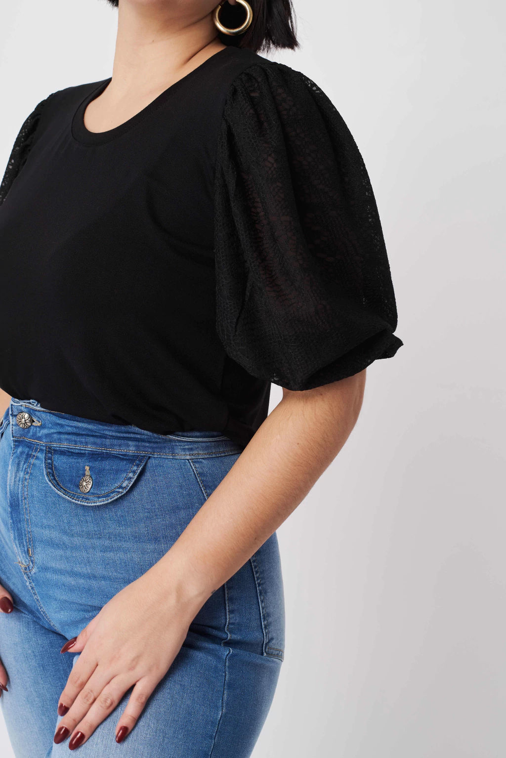 La Remera Pasiflora combina romanticismo y elegancia en una silueta femenina y actual. Su diseño mezcla cuerpo en crepe de punto al tono con mangas globo confeccionadas en encaje delicado, aportando textura y sofisticación. Ideal para elevar cualquier look de día o de noche con un toque sutil de distinción.