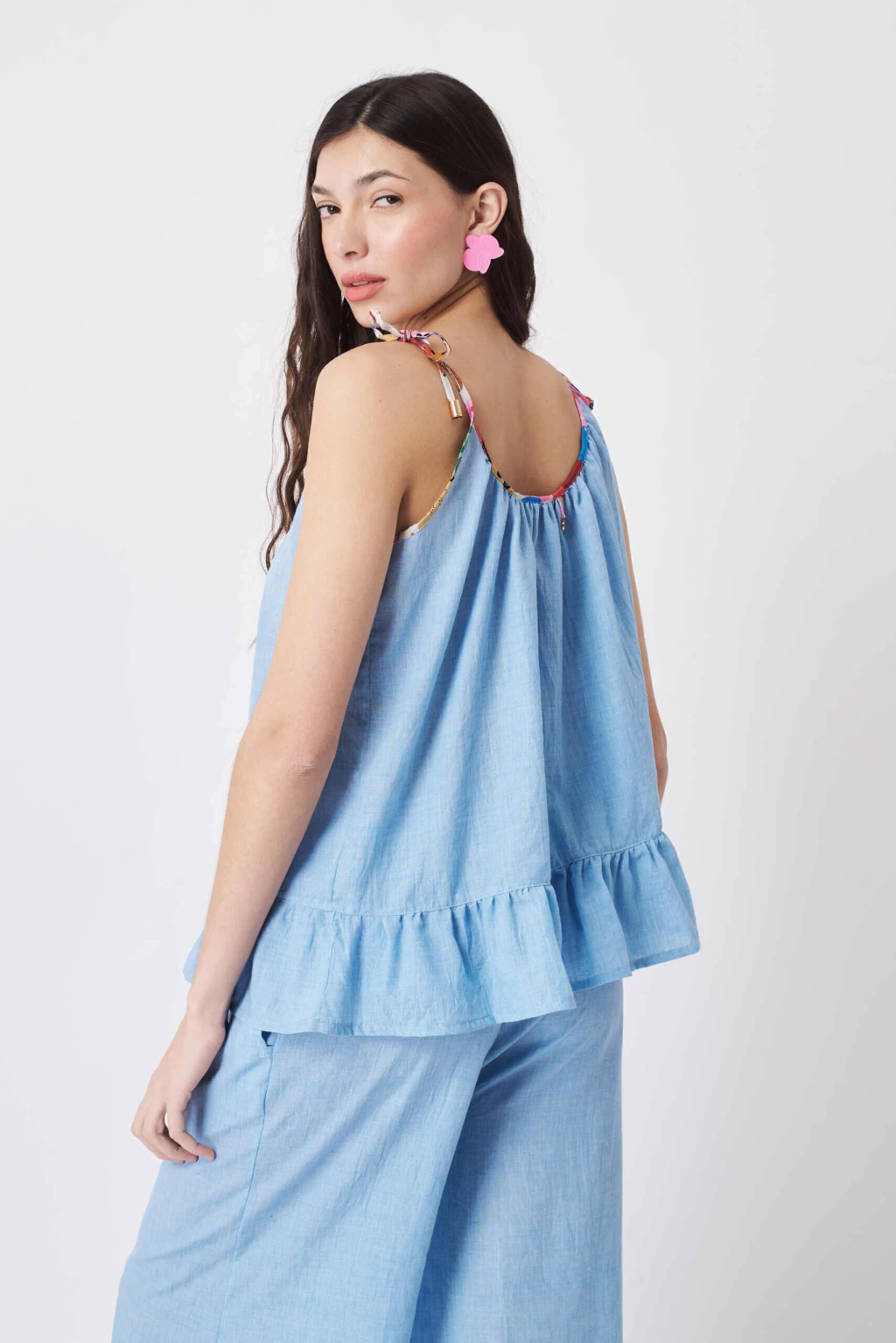 El Top Chambre de Utzzia está confeccionado en gasa de algodón con poliéster, un tejido fresco y liviano ideal para los días cálidos. De calce fluido, presenta frunces en el escote delantero y trasero que aportan movimiento y delicadeza. Una prenda versátil y femenina, perfecta para looks relajados con un aire sofisticado.